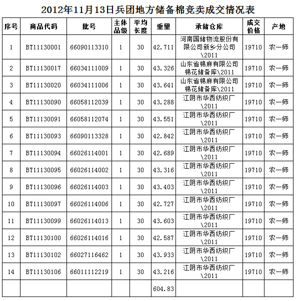 11月13日兵團(tuán)棉花競(jìng)賣成交結(jié)果