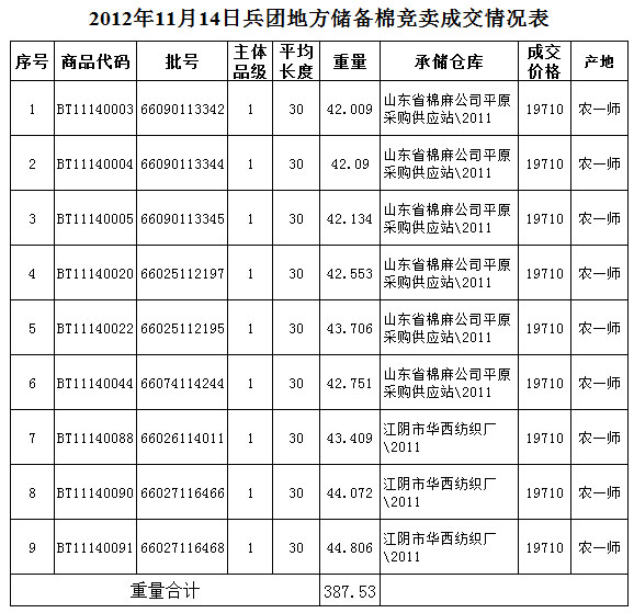 錦橋紡織網(wǎng)—資訊頻道> 棉花信息> 拋儲>正文 11月14日兵團棉花競賣成交結果