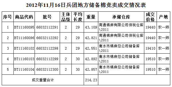 11月16日兵團棉花競賣成交結(jié)果