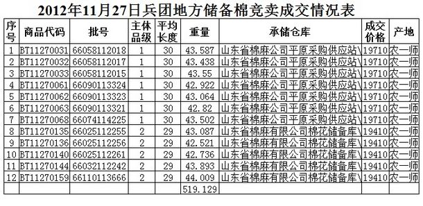 11月27日兵團棉花競賣成交結(jié)果