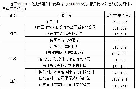 錦橋紡織網(wǎng)—資訊頻道> 棉花信息> 拋儲>正文 11月8日兵團(tuán)棉花競賣預(yù)告:計劃投放6508噸