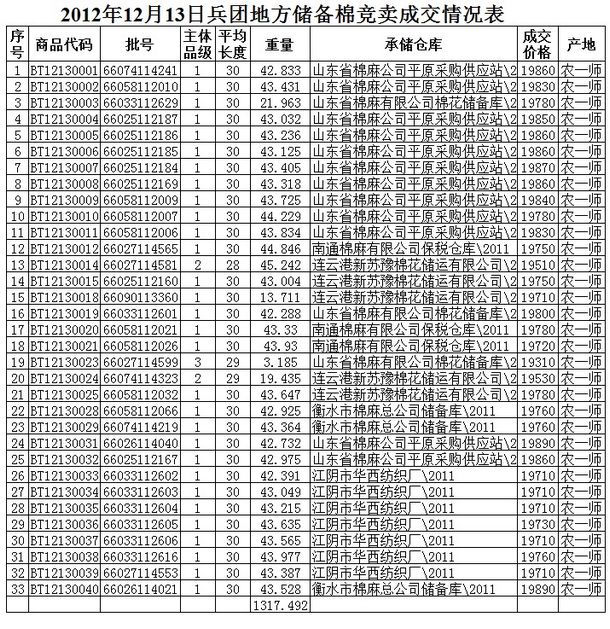 12月13日兵團(tuán)棉花競賣成交結(jié)果