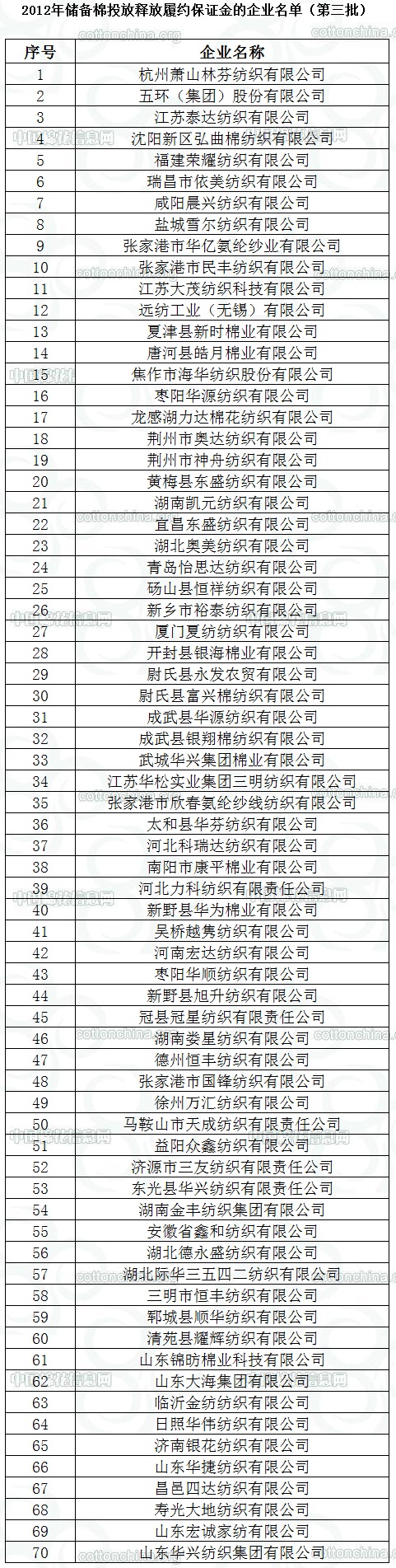 錦橋紡織網(wǎng)—資訊頻道> 棉花信息> 拋儲>正文 2012年儲備棉投放釋放履約保證金的企業(yè)名單(第三批)