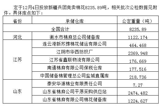 錦橋紡織網(wǎng)—資訊頻道> 棉花信息> 拋儲(chǔ)>正文 12月4日兵團(tuán)棉花競賣預(yù)告:計(jì)劃投放8236噸