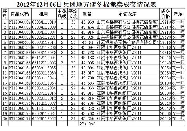 錦橋紡織網(wǎng)—資訊頻道> 棉花信息> 拋儲>正文 12月6日兵團棉花競賣成交結(jié)果