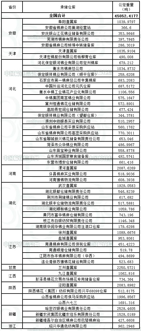 定于9月12日出庫(kù)銷(xiāo)售儲(chǔ)備棉45052.4177噸,相關(guān)批次公檢數(shù)據(jù)見(jiàn)附件。具體庫(kù)點(diǎn)如下: