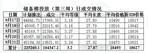 上周(9.17-9.21),儲備棉投放共推出225260.07噸,成交104347.18噸,成交率46.32%,平均等級3.20級,平均長度27.87,加權(quán)平均價(jià)格18493元/噸,折328價(jià)格18627元/噸(公重)。 上周儲備棉投放最高價(jià)為19510元/噸,最低價(jià)17780元/噸。成交資源中2級棉成交17553噸,3級棉成交48540噸,4級棉成交38255噸。 截止到2012年9月21日,儲備棉投放累計(jì)推出662315.76噸,成交321478.27噸,累計(jì)成交比例48.54%,平均等級3.11,平均長度27.88,平均加權(quán)價(jià)18541元/噸,折328級成交價(jià)18634元/噸。