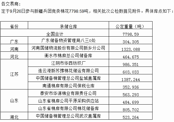 錦橋紡織網(wǎng)—資訊頻道> 棉花信息> 拋儲>正文 9月26日兵團棉花競賣預(yù)告:計劃投放7799噸