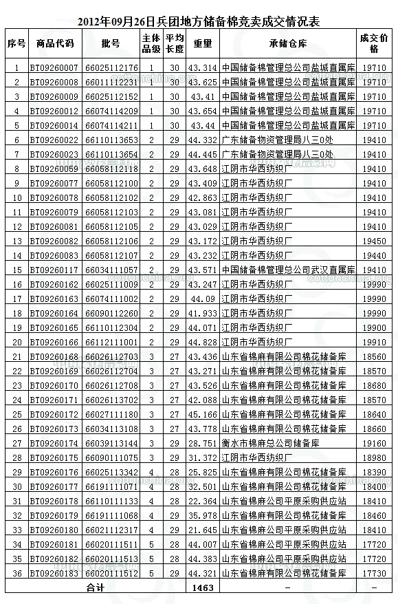 錦橋紡織網(wǎng)—資訊頻道> 棉花信息> 拋儲>正文 9月26日兵團棉花競賣成交結(jié)果