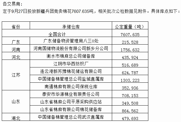 9月27日兵團(tuán)棉花競賣預(yù)告:計(jì)劃投放7607.635噸