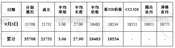 9月3日儲備棉投放數(shù)量為35708.002噸,實際成交21731.031噸,成交比例60.85%;當(dāng)日成交儲備棉平均等級為3.06,平均長度27.9,加權(quán)成交價18483元/噸,折328級成交價為18534元/噸(公重),與當(dāng)日CCIndex328價格比略低17元/噸,較當(dāng)日撮合近月價格低517元/噸。