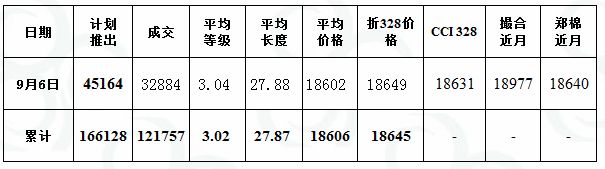 9月6日儲備棉投放數(shù)量為45163.79噸,實際成交32884.43噸,成交比例72.81%,較昨日成交減少1362.62噸;當日成交儲備棉平均等級為3.04,較昨日上升0.02級;平均長度27.88,較昨日增長0.05;加權(quán)成交價18602元/噸,折328級成交價為18649元/噸(公重),較昨日下跌20元/噸(公重),比當日CCIndex328價格比高出18元/噸;較當日撮合近月價格低328元/噸。截止到6日儲備棉投放已累計成交121757.50噸,累計成交比列73.29%,平均等級3.02,平均長度27.87,平均加權(quán)價18606元/噸,折328級成交價18645元/噸。