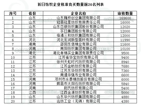 首日儲備棉投放紡織企業(yè)核準(zhǔn)競買數(shù)量前20名列表(前四批)