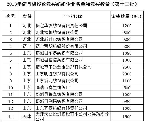 2013年儲備棉投放競買紡織企業(yè)名單和競買數(shù)量(第十二批)