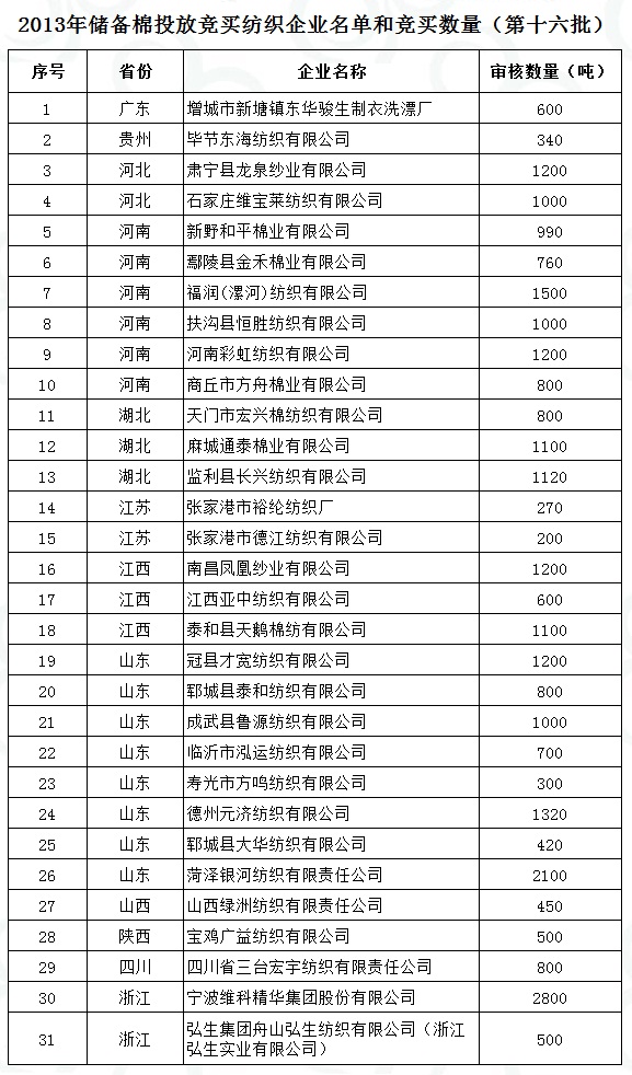 2013年儲(chǔ)備棉投放競(jìng)買(mǎi)紡織企業(yè)名單和競(jìng)買(mǎi)數(shù)量(第十六批)