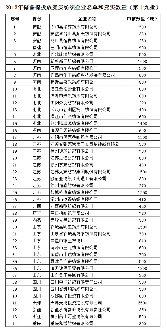 2013年儲備棉投放競買紡織企業(yè)名單和競買數(shù)量(第十九批)