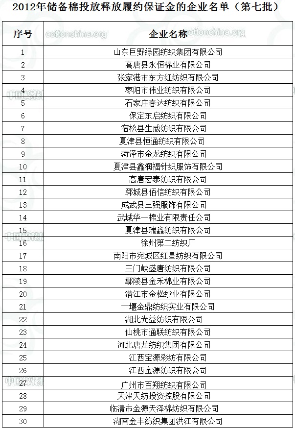 2012年儲(chǔ)備棉投放釋放履約保證金的企業(yè)名單(第七批)