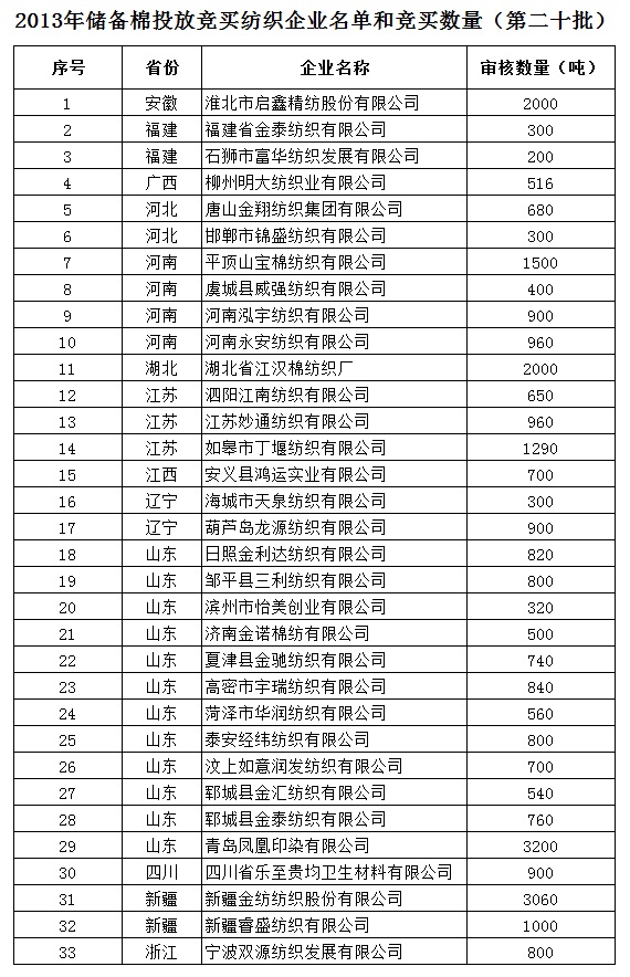 2013年儲(chǔ)備棉投放競(jìng)買紡織企業(yè)名單和競(jìng)買數(shù)量(第二十批)