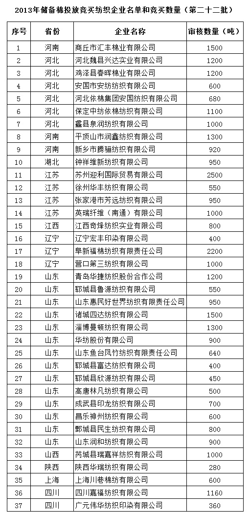 2013年儲備棉投放競買紡織企業(yè)名單和競買數(shù)量(第二十二批)
