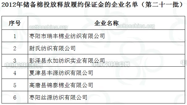 2012年儲備棉投放釋放履約保證金的企業(yè)名單(第二十一批)