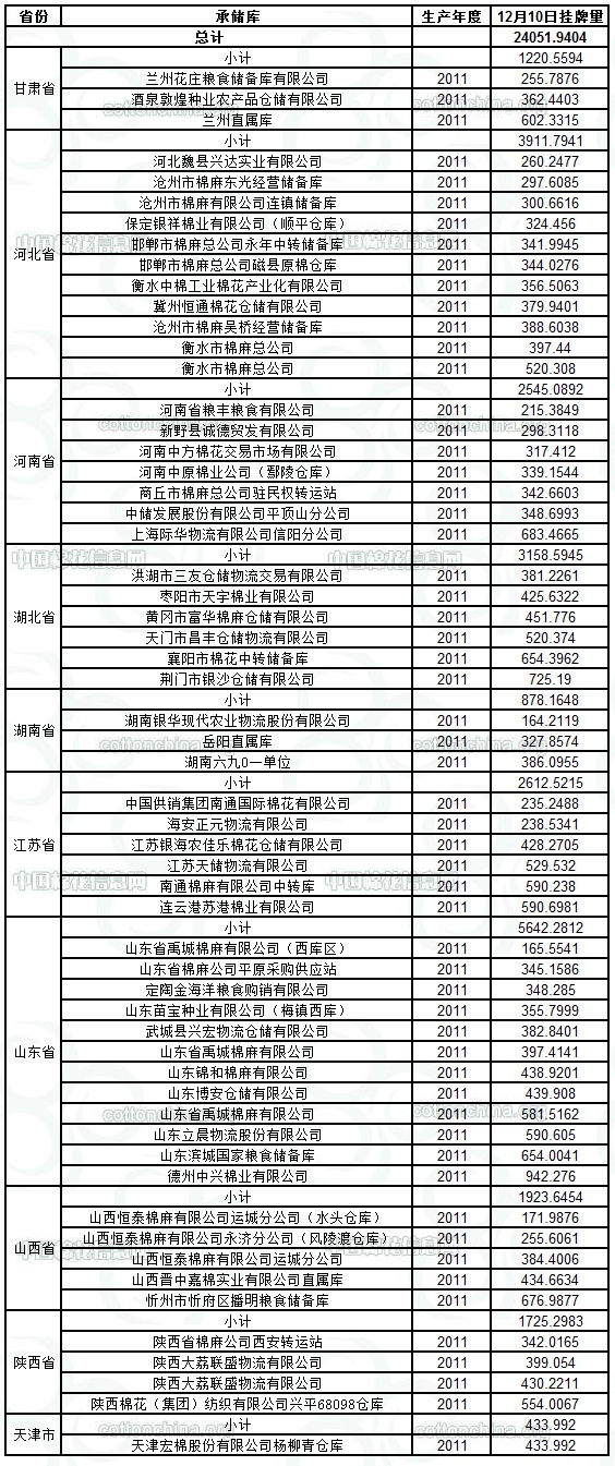 各紡織企業(yè): 定于12月10日出庫銷售儲備棉24051.9404噸。其中2011年度國產(chǎn)棉21277.0844噸,2011年度進(jìn)口棉2774.8560噸。相關(guān)批次公檢數(shù)據(jù)見附件。具體庫點如下: