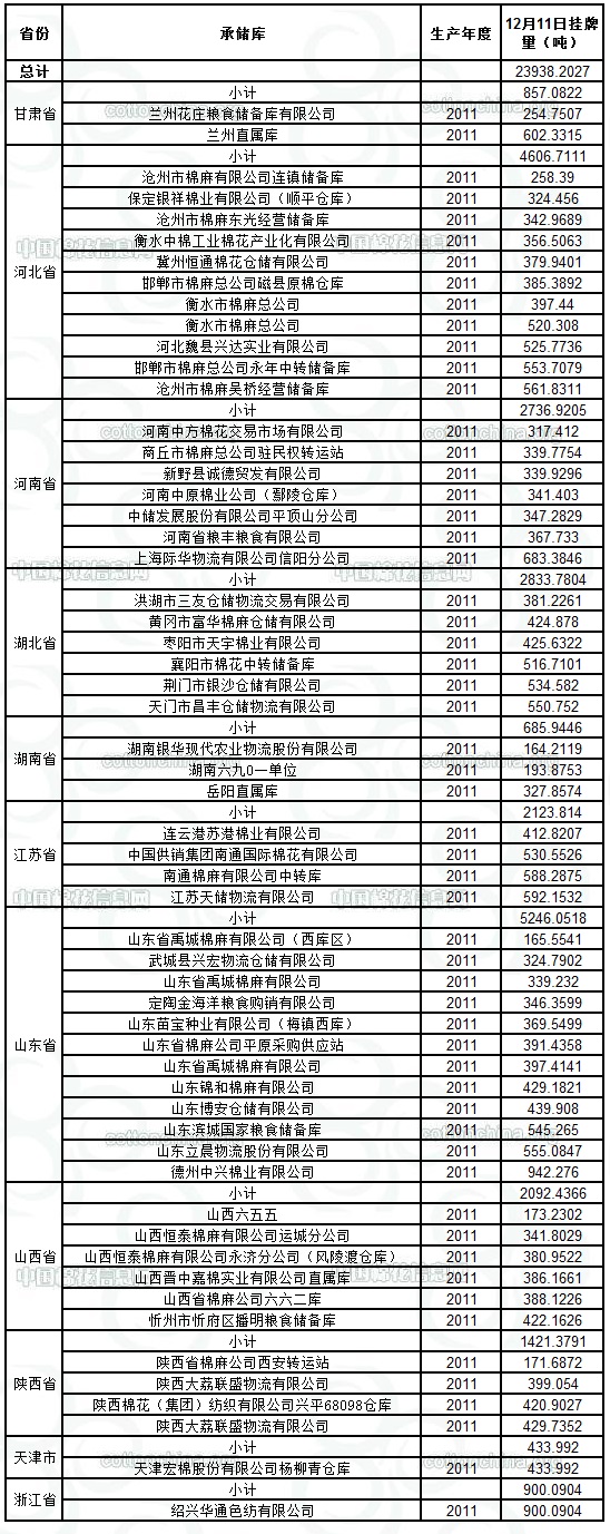 各紡織企業(yè): 定于12月11日出庫銷售儲備棉23938.2027噸。其中2011年度國產(chǎn)棉20359.2136噸,2011年度進(jìn)口棉3578.9891噸。相關(guān)批次公檢數(shù)據(jù)見附件。具體庫點如下: