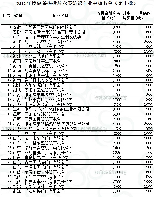 2013年度儲(chǔ)備棉投放競(jìng)買紡織企業(yè)審核名單(第十批)