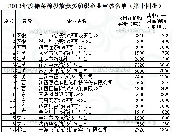 2013年度儲備棉投放競買紡織企業(yè)審核名單(第十四批)
