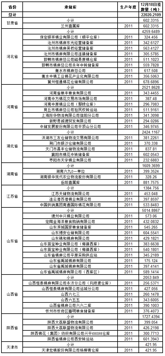 各紡織企業(yè): 定于12月18日出庫銷售儲備棉22020.2109噸。其中2011年度國產(chǎn)棉20095.2748噸,2011年度進口棉1924.9361噸。相關(guān)批次公檢數(shù)據(jù)見附件。具體庫點如下: