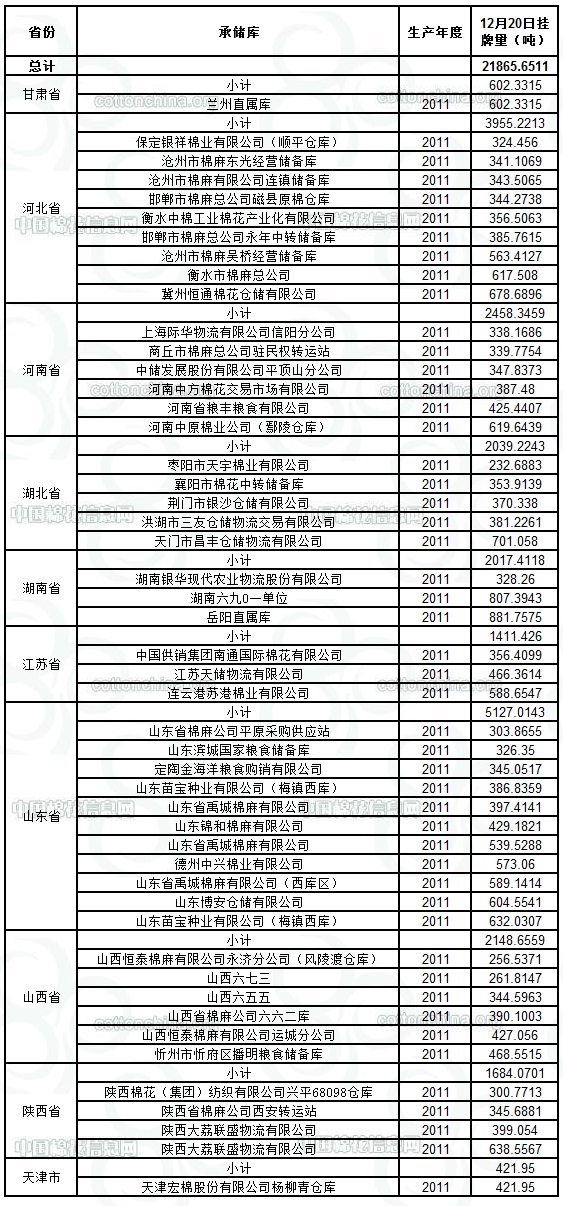 各紡織企業(yè): 定于12月20日出庫銷售儲備棉21865.6511噸。其中2011年度國產(chǎn)棉19822.噸,2011年度進(jìn)口棉2043.4567噸。相關(guān)批次公檢數(shù)據(jù)見附件。具體庫點如下: