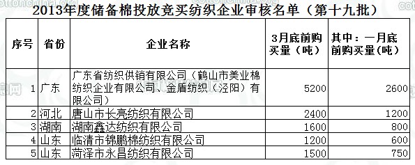 2013年度儲備棉投放競買紡織企業(yè)審核名單(第十九批)