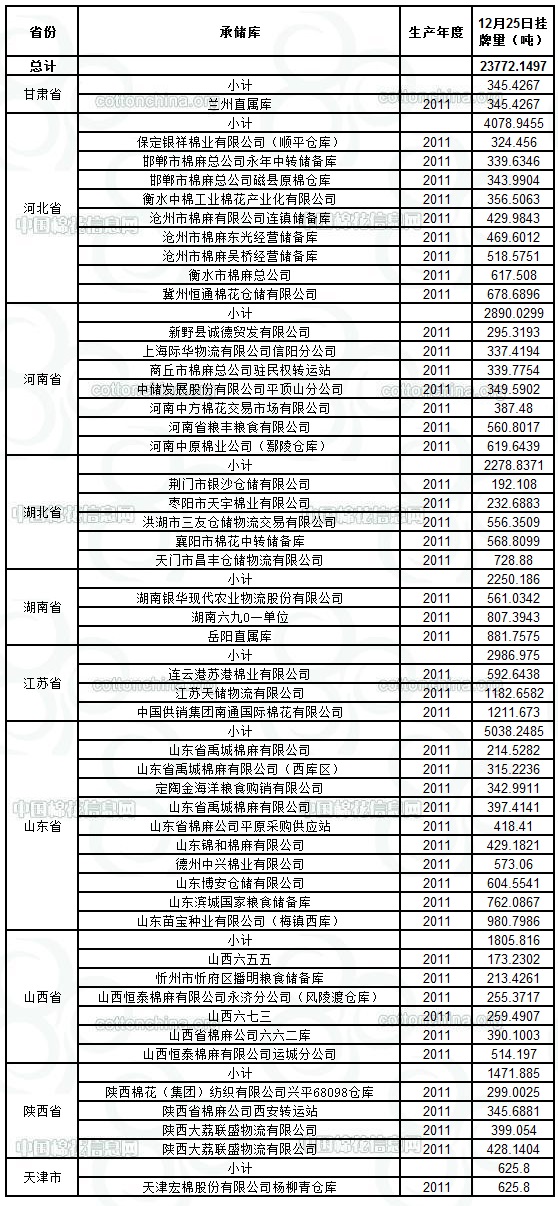 定于12月25日出庫銷售儲備棉23772.1497噸。其中2011年度國產(chǎn)棉19804.3761噸,2011年度進口棉3967.7736噸。相關(guān)批次公檢數(shù)據(jù)見附件。具體庫點如下: