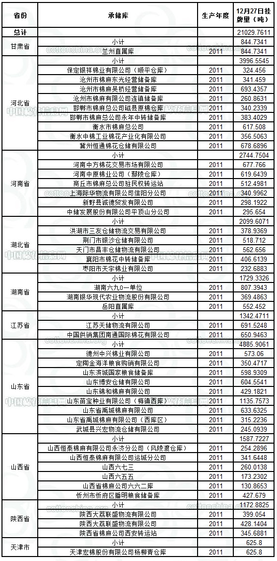 各紡織企業(yè): 定于12月27日出庫銷售儲備棉21029.7611噸。其中2011年度國產(chǎn)棉18551.5327噸,2011年度進口棉2478.2284噸。相關批次公檢數(shù)據(jù)見附件。具體庫點如下: