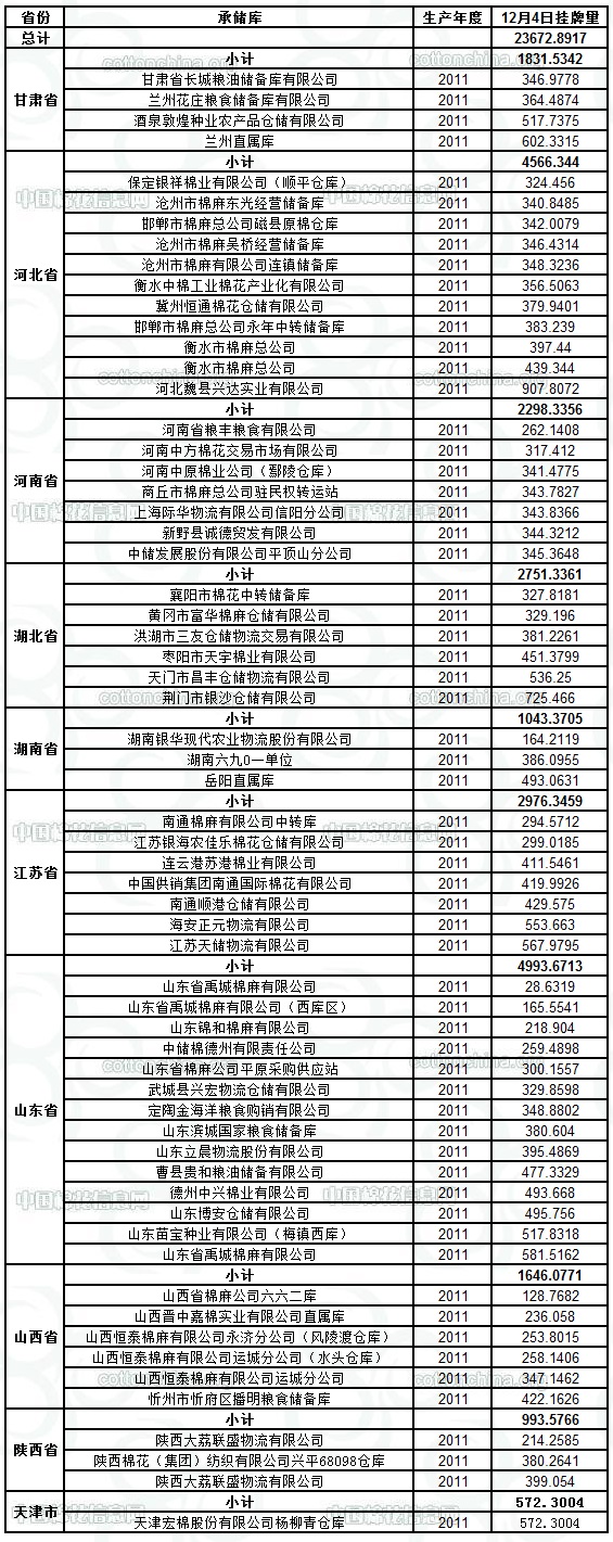 定于12月4日出庫(kù)銷售儲(chǔ)備棉23672.8917噸。其中2011年度國(guó)產(chǎn)棉20340.5876噸,2011年度進(jìn)口棉3332.2341噸。相關(guān)批次公檢數(shù)據(jù)見附件。具體庫(kù)點(diǎn)如下: