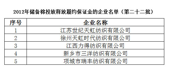 2012年儲備棉投放釋放履約保證金的企業(yè)名單(第二十二批)