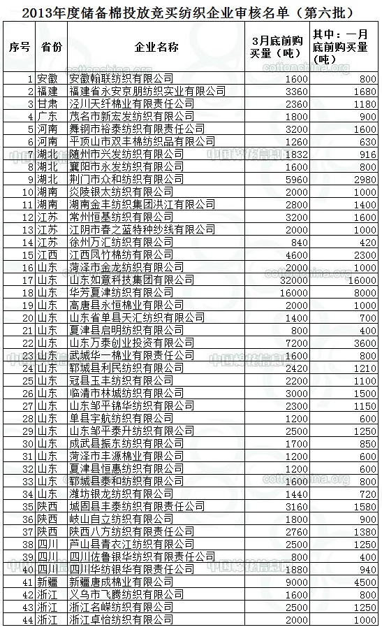 2013年度儲(chǔ)備棉投放競(jìng)買紡織企業(yè)審核名單(第六批)