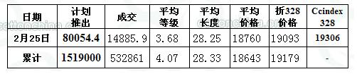 2月25日儲(chǔ)備棉投放數(shù)量為80054.396噸,實(shí)際成交14885.9噸,成交比例18.6%;當(dāng)日成交儲(chǔ)備棉平均等級(jí)為3.68,較前一交易日提高0.14;平均長(zhǎng)度28.25,較前一交易日增加0.15;加權(quán)成交價(jià)18760元/噸,較上一日漲111元,折328級(jí)成交價(jià)為19093元/噸(公重),較上一日漲3元,比當(dāng)日CCIndex328價(jià)格比低213元/噸。截止2月25日,累計(jì)上市總量1518999.698噸,累計(jì)成交總量532861.0437噸,成交比例35.08%。