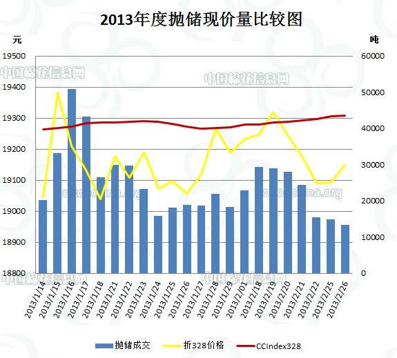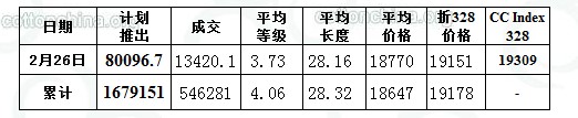 2月26日儲(chǔ)備棉投放數(shù)量為80096.74噸,實(shí)際成交13420.08噸,成交比例16.75%;當(dāng)日成交儲(chǔ)備棉平均等級(jí)為3.73,較前一交易日平均等級(jí)低0.05;平均長(zhǎng)度28.16,較前一交易日平均長(zhǎng)度低0.09;加權(quán)成交價(jià)18770元/噸,折328級(jí)成交價(jià)為19151元/噸(公重),比當(dāng)日CCIndex328價(jià)格比低158元/噸。截止2月26日,累計(jì)上市總量1679150.84噸,累計(jì)成交總量546281.13噸,成交比例32.53%。