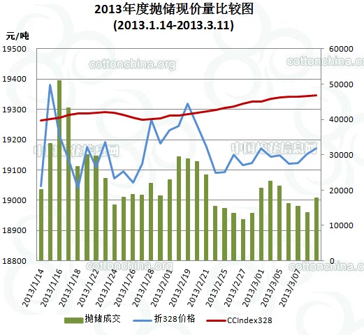 3月11日儲(chǔ)備棉投放數(shù)量為70074.7618噸,實(shí)際成交17719.168噸,成交比例25.29%,較前一交易日升高6.1%;當(dāng)日成交儲(chǔ)備棉平均等級(jí)為3.83,較前一交易日升高0.07;平均長度28.38,較前一交易日提高0.17;加權(quán)成交價(jià)18775元/噸,較上一日高11元,折328級(jí)成交價(jià)19172元/噸(公重),漲18元,比當(dāng)日CCIndex328價(jià)格低174元/噸。截止3月11日,累計(jì)上市總量2376319.942噸,累計(jì)成交總量698470.3316噸,成交比例29.39%。