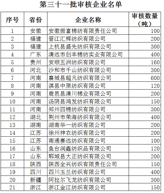 2013年儲(chǔ)備棉投放競(jìng)買紡織企業(yè)名單和競(jìng)買數(shù)量(第三十一批)