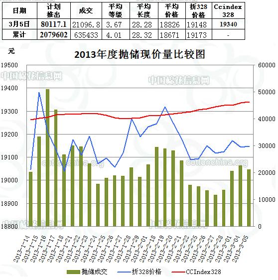 3月5日儲(chǔ)備棉投放數(shù)量為80117.1385噸,實(shí)際成交21096.7866噸,成交比例26.33%,較前一交易日降低1.76%;當(dāng)日成交儲(chǔ)備棉平均等級(jí)為3.67,較前一交易日提高0.04;平均長(zhǎng)度28.28,提高0.01;加權(quán)成交價(jià)18826元/噸,較上一日漲34元,折328級(jí)成交價(jià)19148元/噸(公重),漲4元,比當(dāng)日CCIndex328價(jià)格低192元/噸。截止3月5日,累計(jì)上市總量2079602噸,累計(jì)成交總量635433噸,成交比例30.56%。