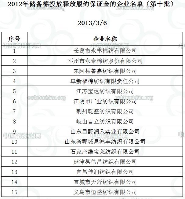 2012年儲(chǔ)備棉投放釋放履約保證金的企業(yè)名單(第十批)