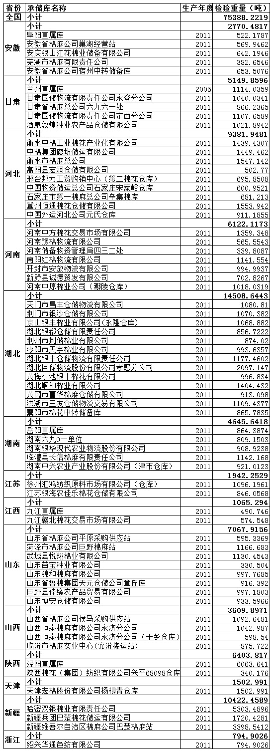 中國(guó)儲(chǔ)備棉管理總公司定于3月7日出庫(kù)銷售儲(chǔ)備棉75388.2219噸,相關(guān)批次公檢數(shù)據(jù)見附件。具體庫(kù)點(diǎn)如下: