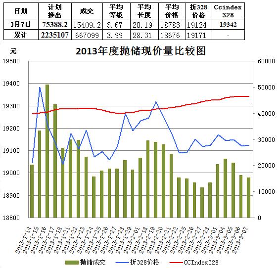 3月7日儲(chǔ)備棉投放數(shù)量為75388.2219噸,實(shí)際成交15409.2068噸,成交比例20.44%,較前一交易日提高0.15%;當(dāng)日成交儲(chǔ)備棉平均等級(jí)為3.67,較前一交易日提高0.05;平均長度28.19,降低0.09;加權(quán)成交價(jià)18783元/噸,較上一日提高16元,折328級(jí)成交價(jià)19124元/噸(公重),漲3元,比當(dāng)日CCIndex328價(jià)格低218元/噸。截止3月7日,累計(jì)上市總量2235106.612噸,累計(jì)成交總量667099.0091噸,成交比例29.85%。