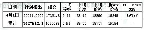 4月1日儲備棉投放數(shù)量為69971.0303噸,實際成交17261.8037噸,成交比例24.67%;當日成交儲備棉平均等級為3.77,較前一交易日高0.13;平均長度28.43,較前一交易日高0.06;加權成交價18896元/噸,較上一交易日高75元/噸,折328級成交價19249元/噸(公重),低10元/噸,比當日CCIndex328價格低128元/噸。截止4月1日,累計上市總量3427912.141噸,累計成交總量1025678.077噸,成交比例29.92%。