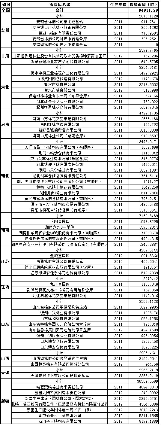 中國儲備棉管理總公司定于4月25日出庫銷售儲備棉94911.2900噸,相關批次公檢數(shù)據(jù)見附件。具體庫點如下: