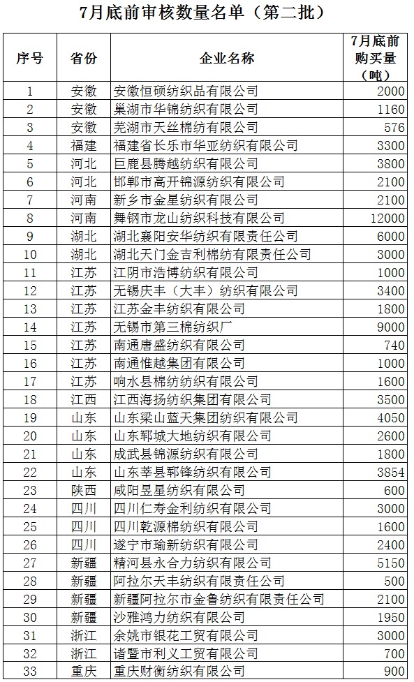 2013年儲(chǔ)備棉投放7月底前審核競(jìng)買紡織企業(yè)名單(第二批)