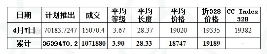 4月7日儲(chǔ)備棉投放數(shù)量為70183.7247噸,實(shí)際成交15070.4207噸,成交比例21.47%;當(dāng)日成交儲(chǔ)備棉平均等級(jí)為3.67,較前一交易日高0.01;平均長(zhǎng)度28.37,較前一交易日低0.03;加權(quán)成交價(jià)19020元/噸,較上一交易日高56元/噸,折328級(jí)成交價(jià)19335元/噸(公重),較上一日高61元/噸,比當(dāng)日CCIndex328價(jià)格低47元/噸。截止4月7日,累計(jì)上市總量3639470.244噸,累計(jì)成交總量1071880.04噸,成交比例29.45%。