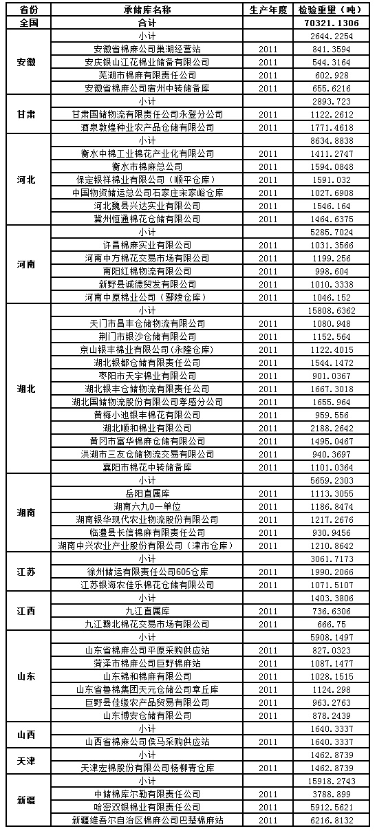 中國儲備棉管理總公司定于4月8日出庫銷售儲備棉70321.1306噸,相關(guān)批次公檢數(shù)據(jù)見附件。具體庫點如下: