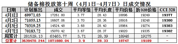 上周(4.1-4.7)適逢“清明節(jié)”小長假,四個工作日累計推出拋儲資源281529噸,較上周推出資源少68953噸;當(dāng)周實際成交63464噸,較上周實際成交減少67396噸;當(dāng)周成交比例22.54%;平均等級3.71,平均長度28.39,平均價格18946元/噸,折328價格19275元/噸。